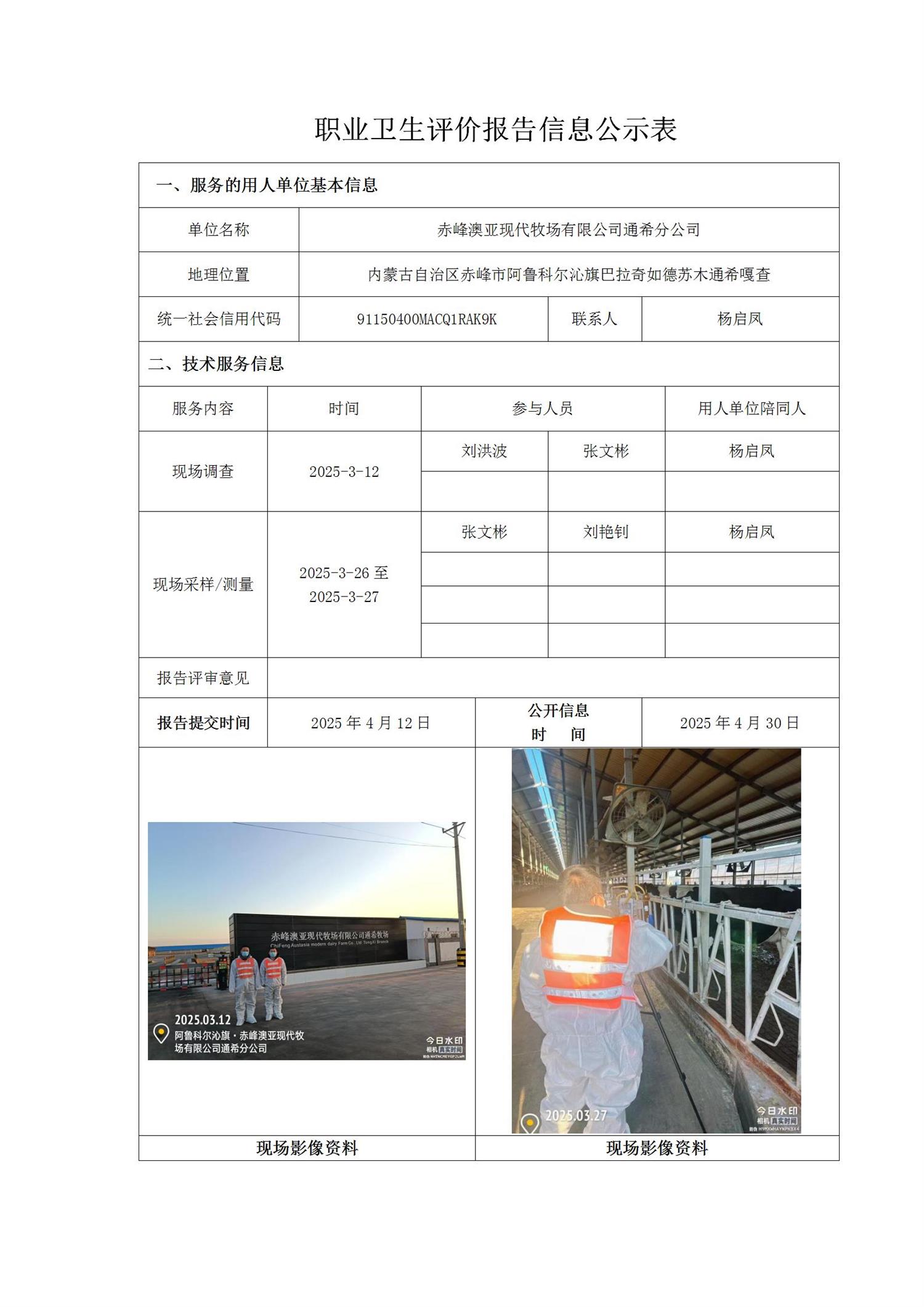 赤峰澳亚现代牧场有限公司通希分公司奶牛养殖场职业病危害因素定期检测