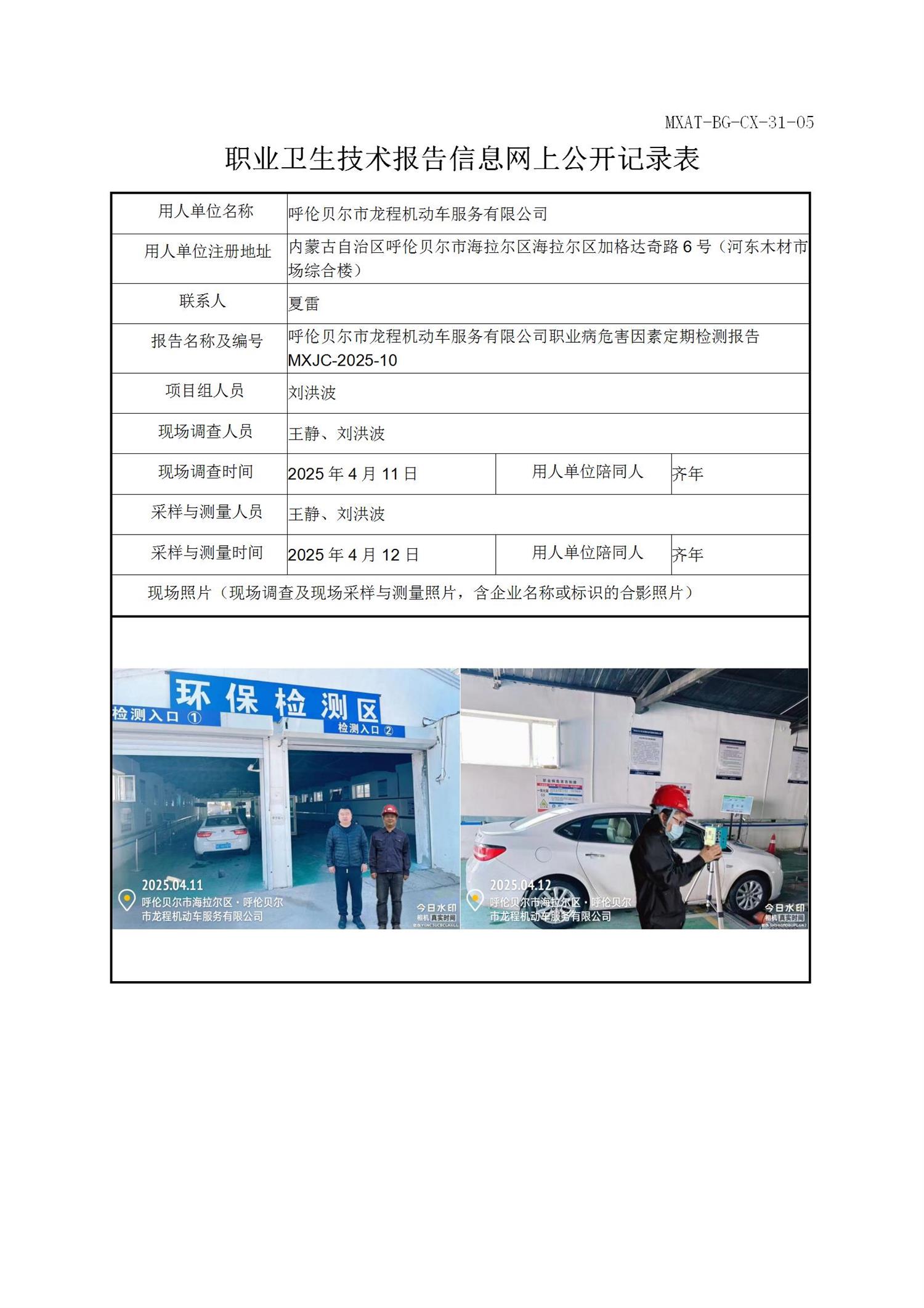 呼伦贝尔市龙程机动车服务有限公司职业病危害因素定期检测