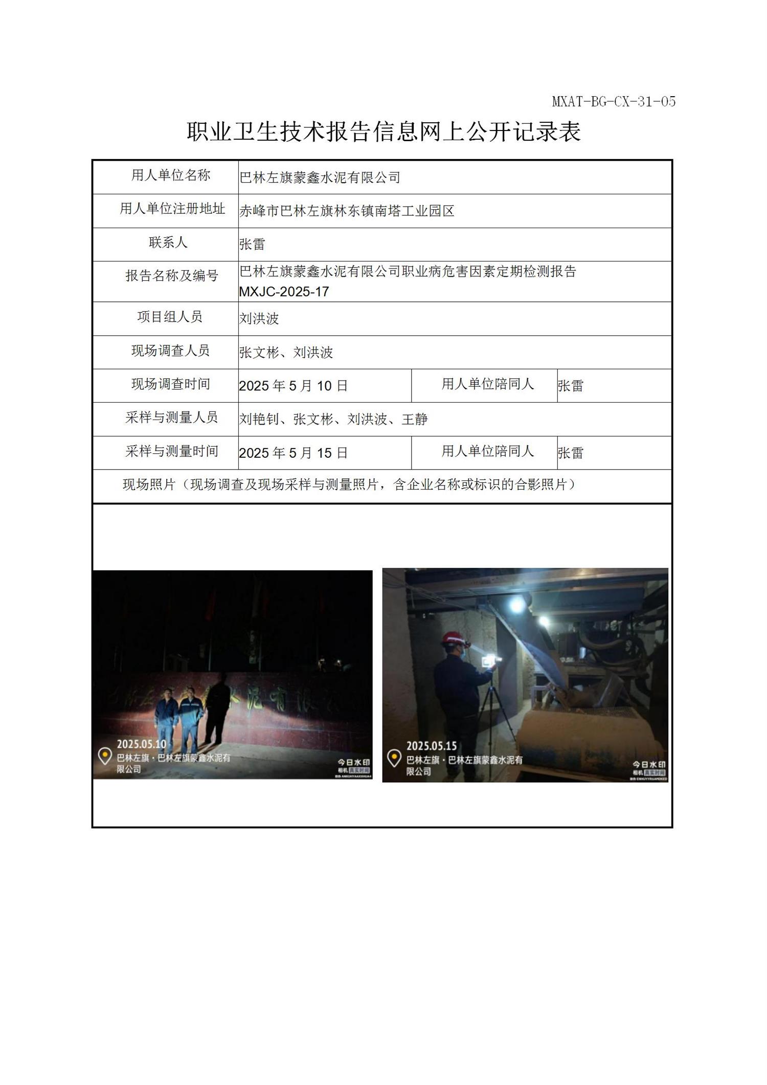 巴林左旗蒙鑫水泥有限公司职业病危害因素定期检测