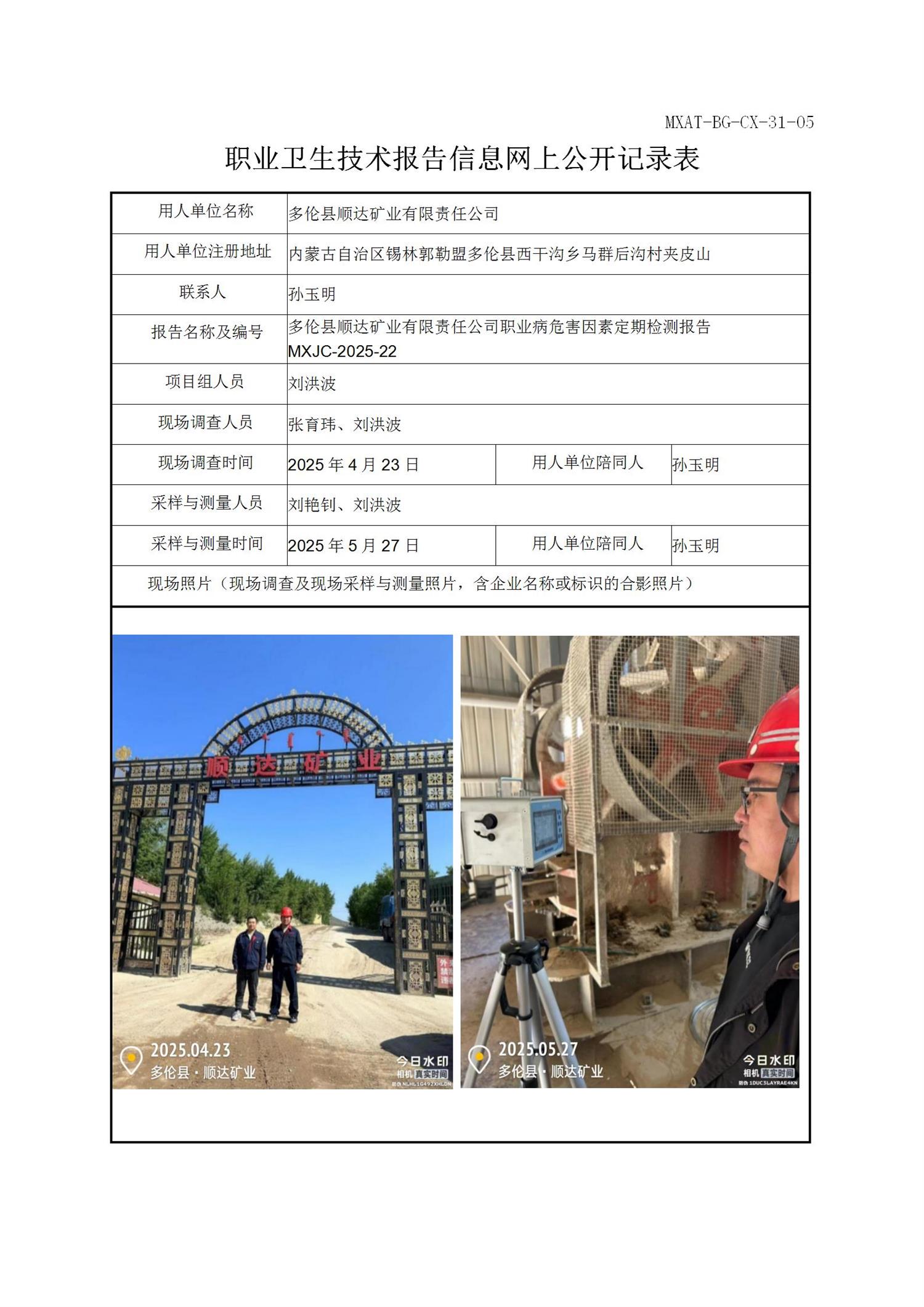 多伦县顺达矿业有限责任公司职业病危害因素定期检测