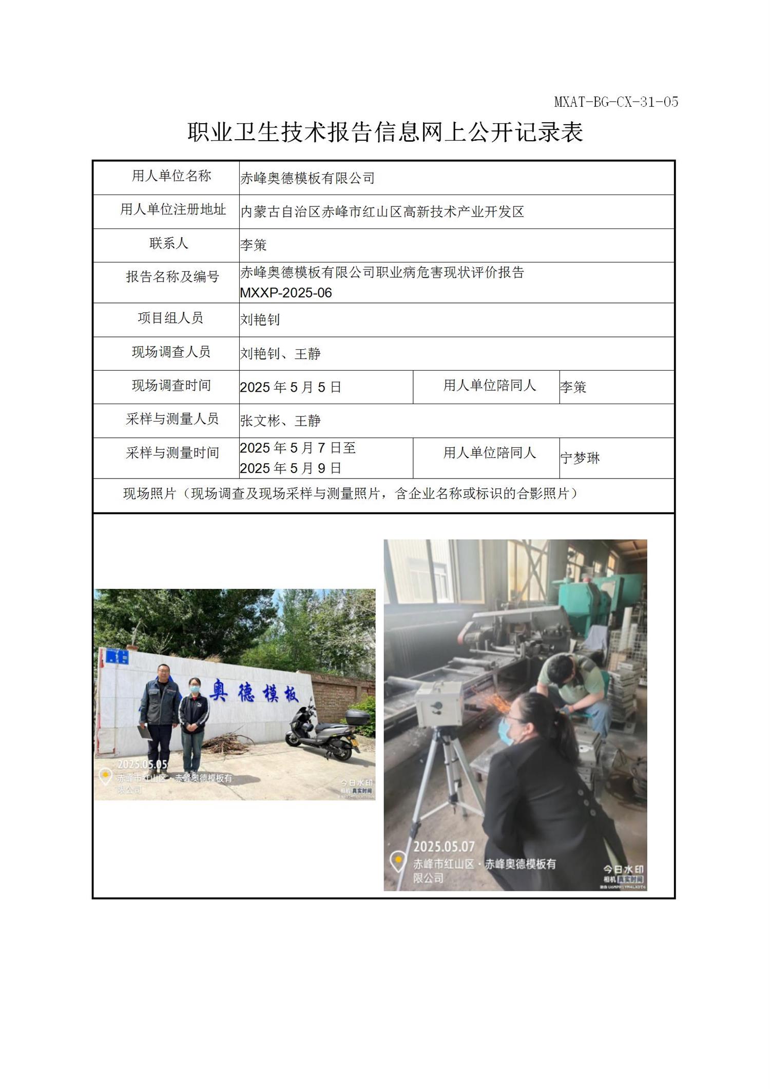 赤峰奥德模板有限公司职业病危害因素现状评价