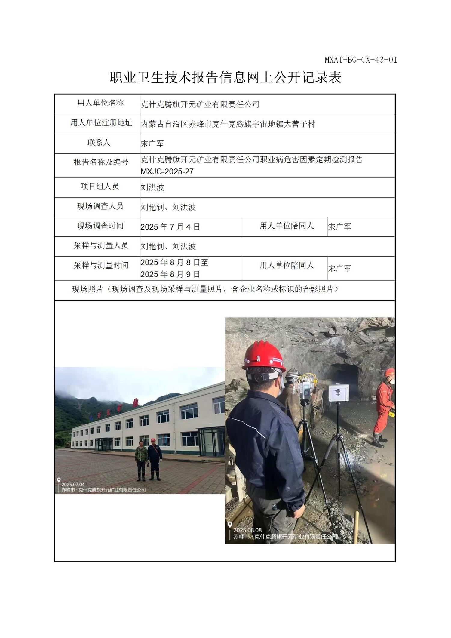 克什克腾旗开元矿业有限责任公司职业病危害因素定期检测