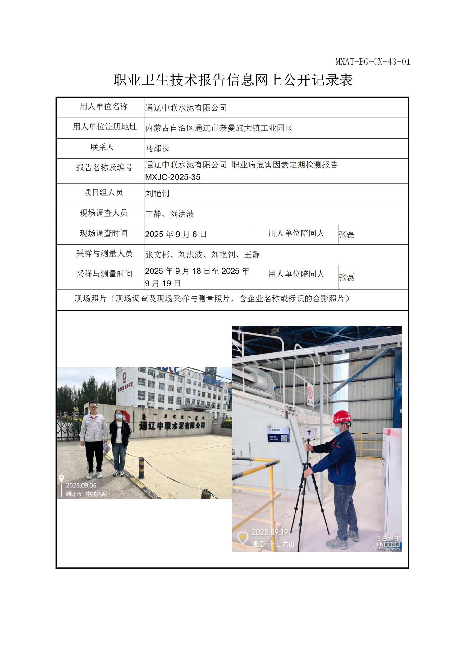 通辽中联水泥有限公司职业病危害因素定期检测