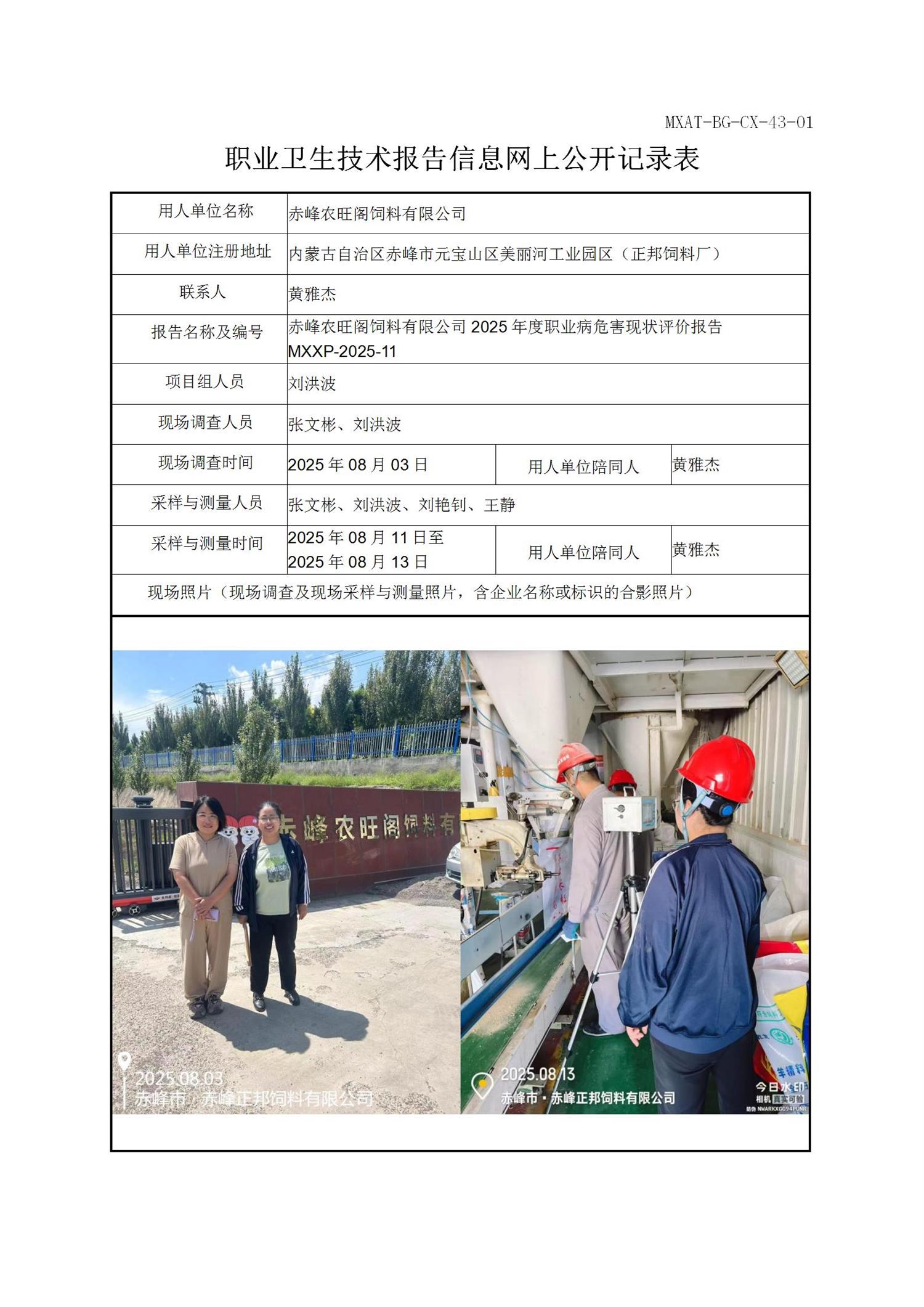 赤峰农旺阁饲料有限公司2025年度职业病危害现状评价报告