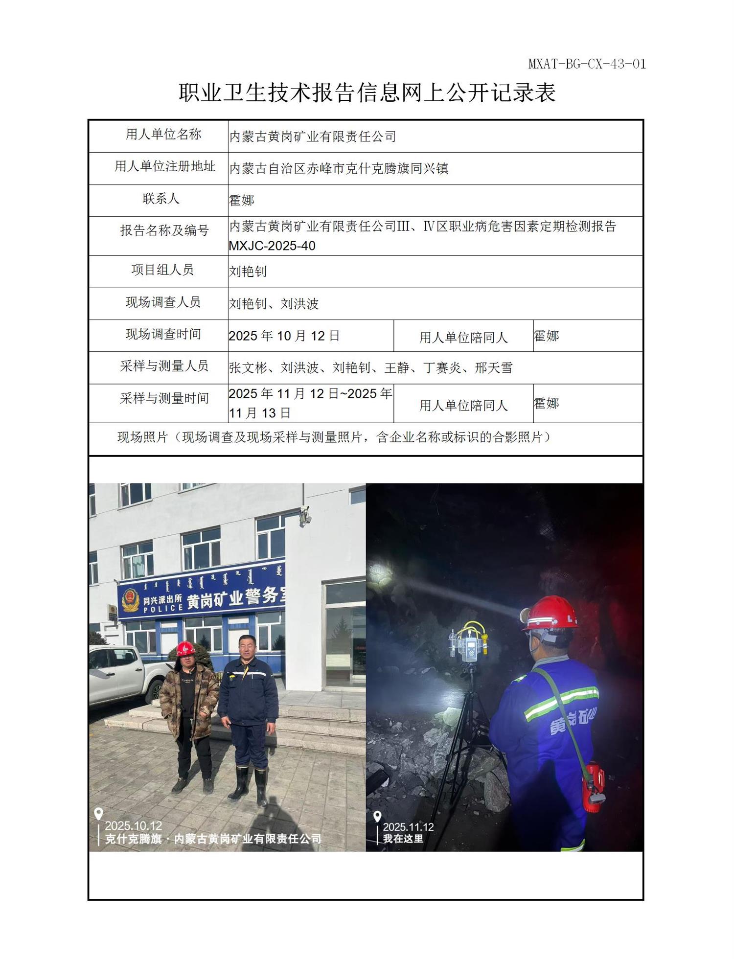 内蒙古黄岗矿业有限责任公司Ⅲ、Ⅳ区工作场所职业病危害因素定期检测报告